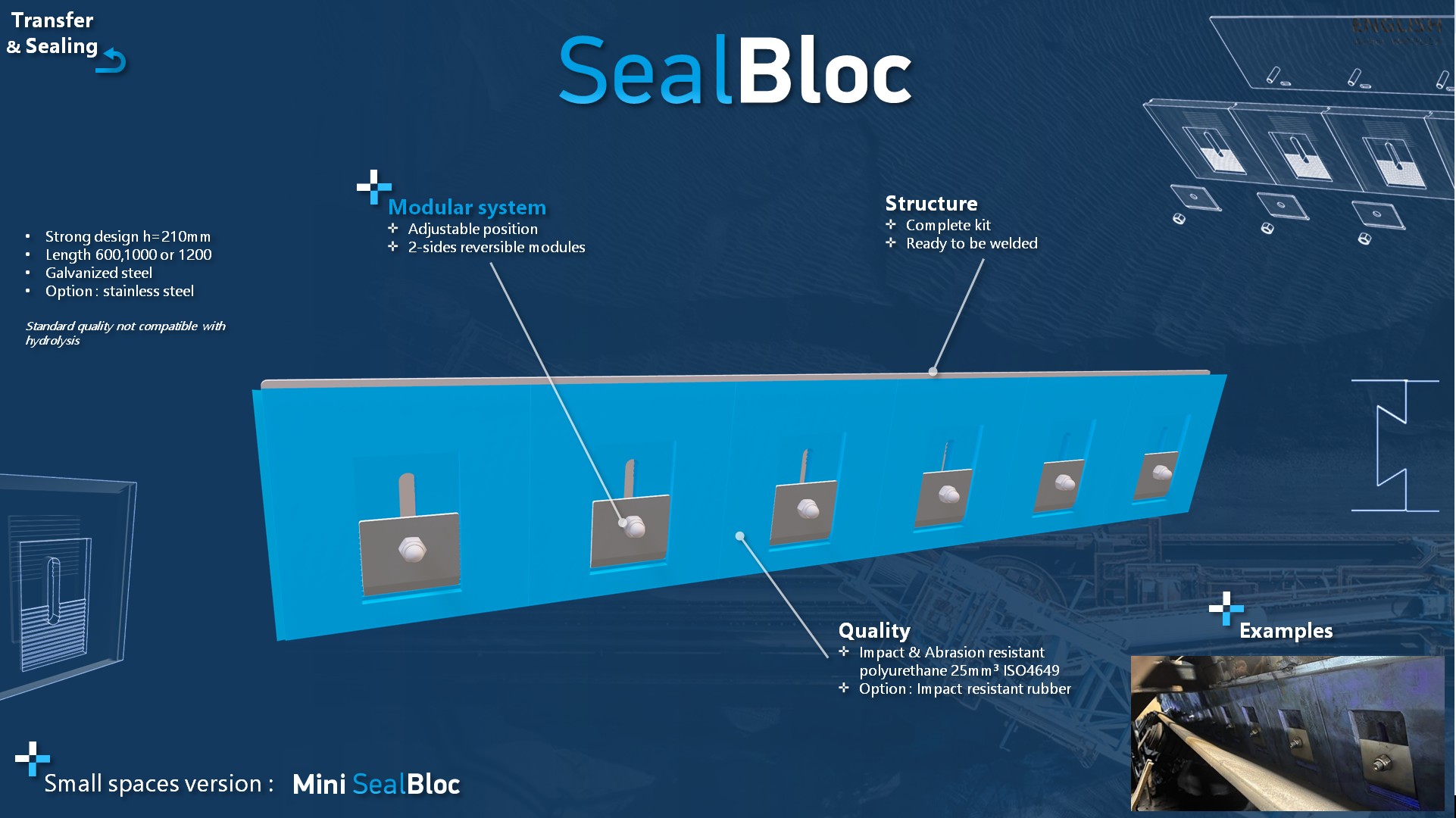 Zástera pozostávajúca z výstužnej dosky, ktorá sa spája s modulmi z gumy odolnej voči oderu 200 mm x 5 (1 000) alebo 6 (1 200). Kompenzácia opotrebenia jednoduchým nastavením kladivom. Iba použité bloky sa rýchlo vymenia za nižšie náklady. Kompatibilné so systémami SUPER-SCREW®*, ISC™ a FIX'N GO®*.